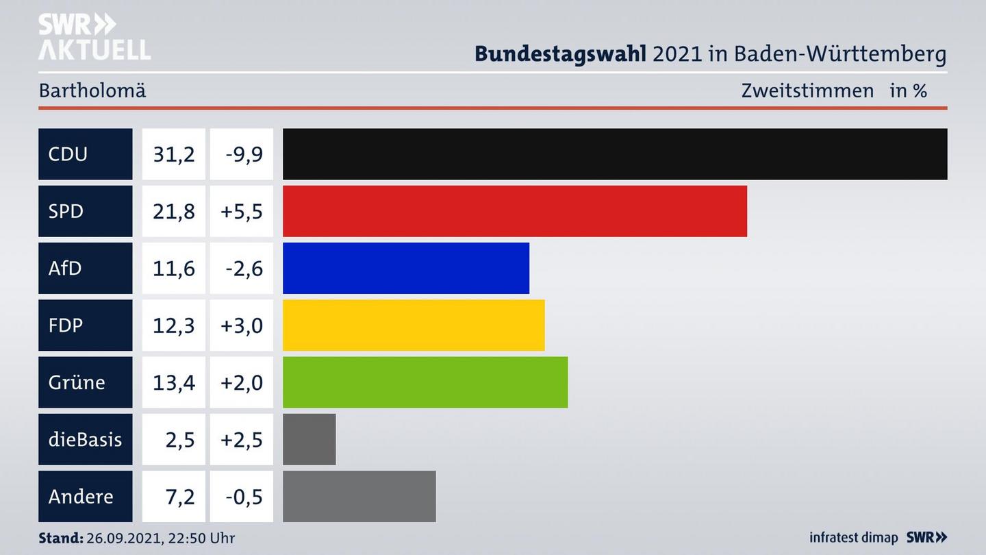 In Bartholomä verliert die CDU stark (-9,9 Prozentpunkte) und erzielt 31,2 Prozent der gültigen Zweitstimmen. Die SPD erreicht 21,8 Prozent und gewinnt stark (+5,5 Prozentpunkte). Die AfD erzielt 11,6 Prozent und verliert leicht (-2,6 Prozentpunkte). Die FDP gewinnt deutlich (+3,0 Prozentpunkte) und kommt auf 12,3 Prozent. Die Grünen erreichen 13,4 Prozent und gewinnen leicht (+2,0 Prozentpunkte). Die 2021 in nicht angetretene Partei dieBasis bekommt 2,5 Prozent. Die Wahlbeteiligung liegt bei 80,8 Prozent.