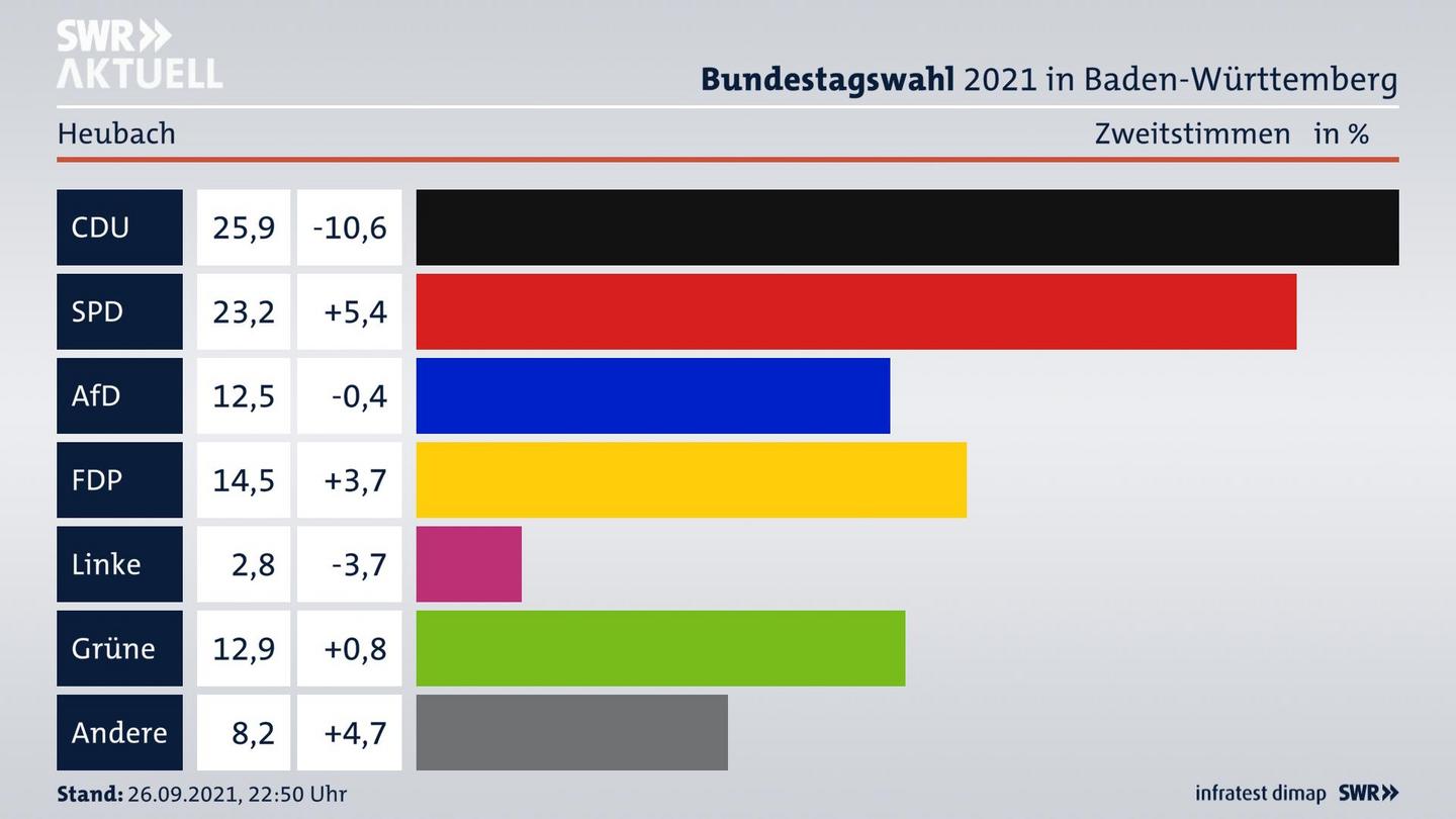 In Heubach verliert die CDU stark (-10,6 Prozentpunkte) und erzielt 25,9 Prozent der gültigen Zweitstimmen. Die SPD erreicht 23,2 Prozent und gewinnt stark (+5,4 Prozentpunkte). Die AfD erzielt 12,5 Prozent und verliert leicht (-0,4 Prozentpunkte). Die FDP gewinnt deutlich (+3,7 Prozentpunkte) und kommt auf 14,5 Prozent. Die Linke erreicht 2,8 Prozent und verliert deutlich (-3,7 Prozentpunkte). Die Grünen erzielen 12,9 Prozent und gewinnen leicht (+0,8 Prozentpunkte). Die Wahlbeteiligung liegt bei 74,4 Prozent.