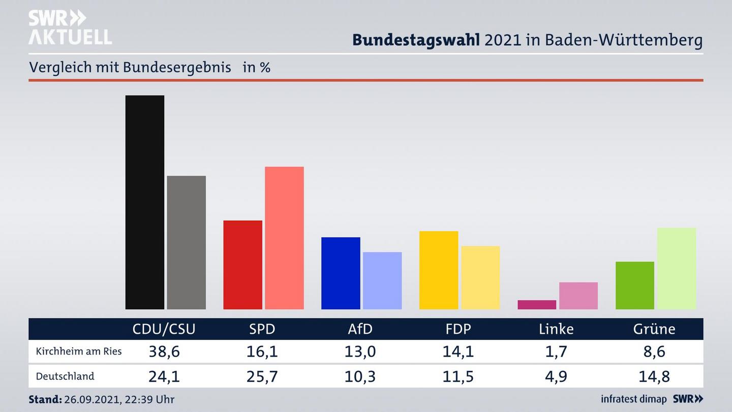 In Kirchheim am Ries verliert die CDU stark (-6,6 Prozentpunkte) und erzielt 38,6 Prozent der gültigen Zweitstimmen. Die SPD erreicht 16,1 Prozent und gewinnt leicht (+1,6 Prozentpunkte). Die AfD erzielt 13,0 Prozent und verliert leicht (-2,1 Prozentpunkte). Die FDP gewinnt stark (+5,2 Prozentpunkte) und kommt auf 14,1 Prozent. Die Grünen erreichen 8,6 Prozent und verlieren leicht (-1,8 Prozentpunkte). Die 2021 in nicht angetretene Partei dieBasis bekommt 2,6 Prozent. Die Wahlbeteiligung liegt bei 77,3 Prozent.